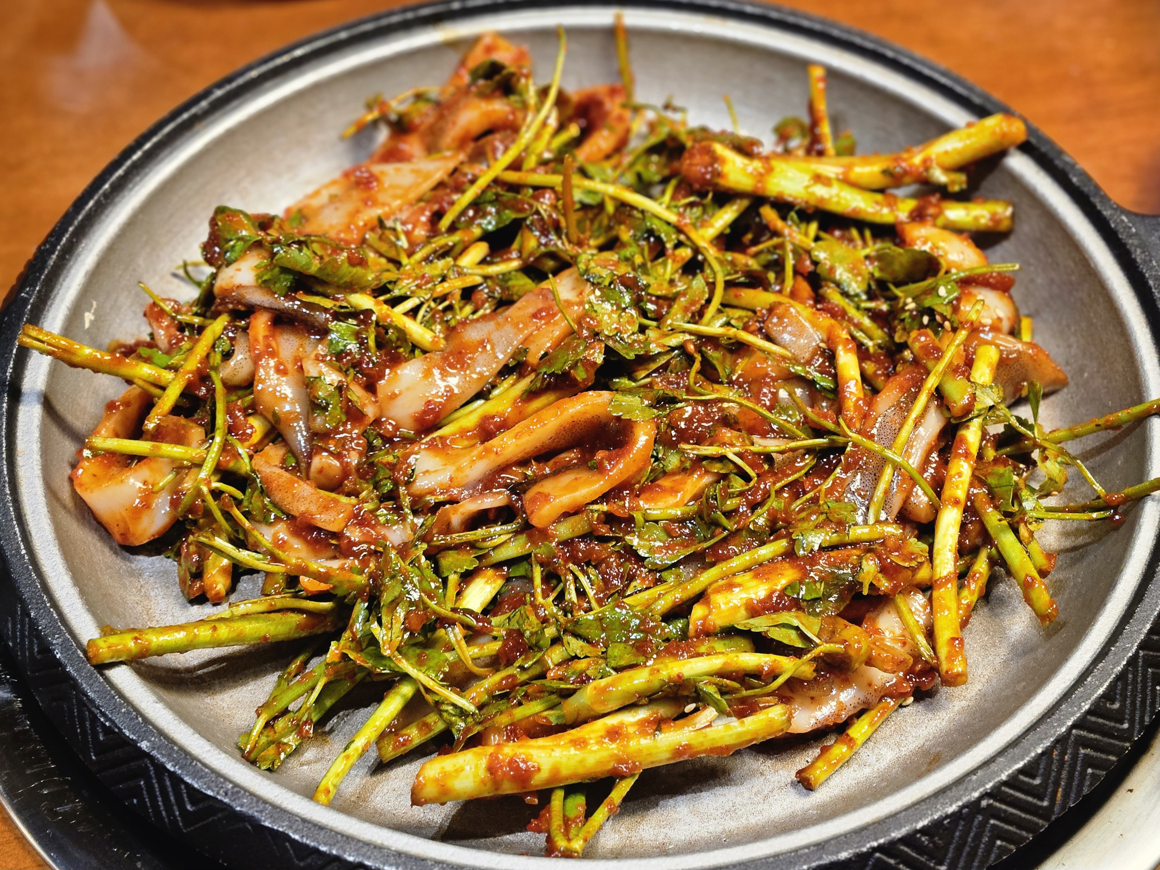 미나리랑 같이 양념에 버무려져서 나오는데