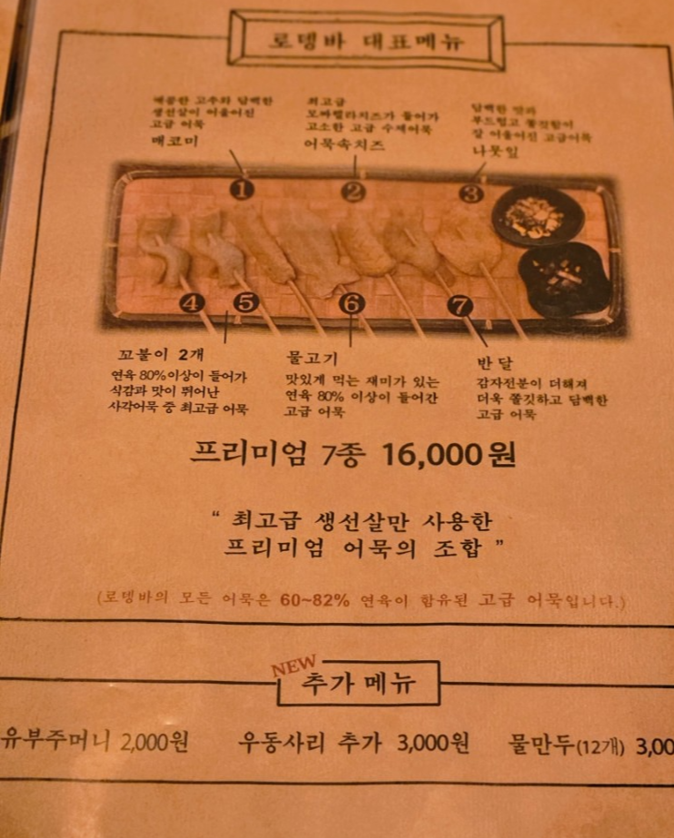 대표 메뉴는 7가지 어묵이 들어가 있는 프리미엄 7종이다. 어묵을 다 먹고 남은 국물에 유부주머니, 우동사리, 물만두 등을 추가로 넣어서 먹어도 좋다.