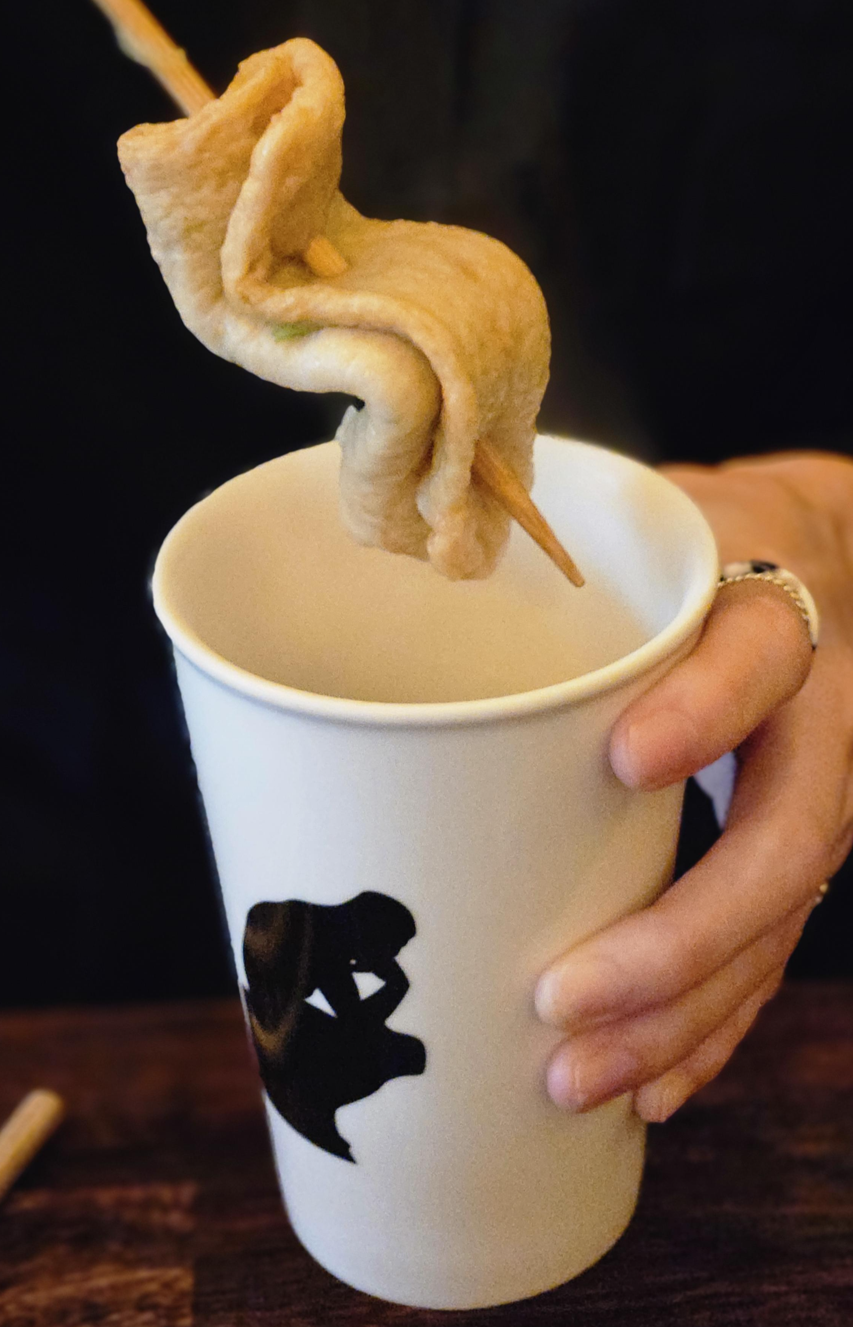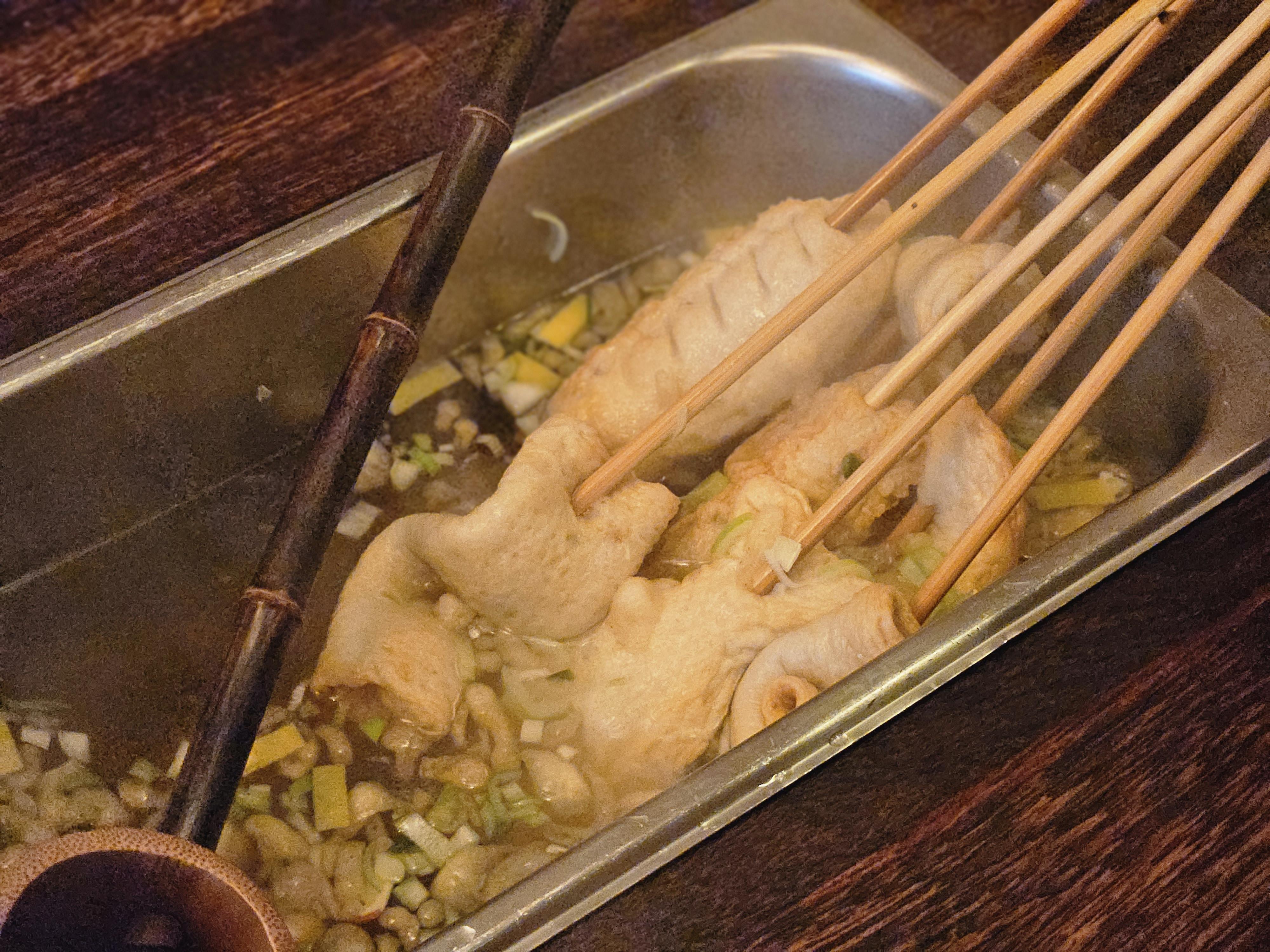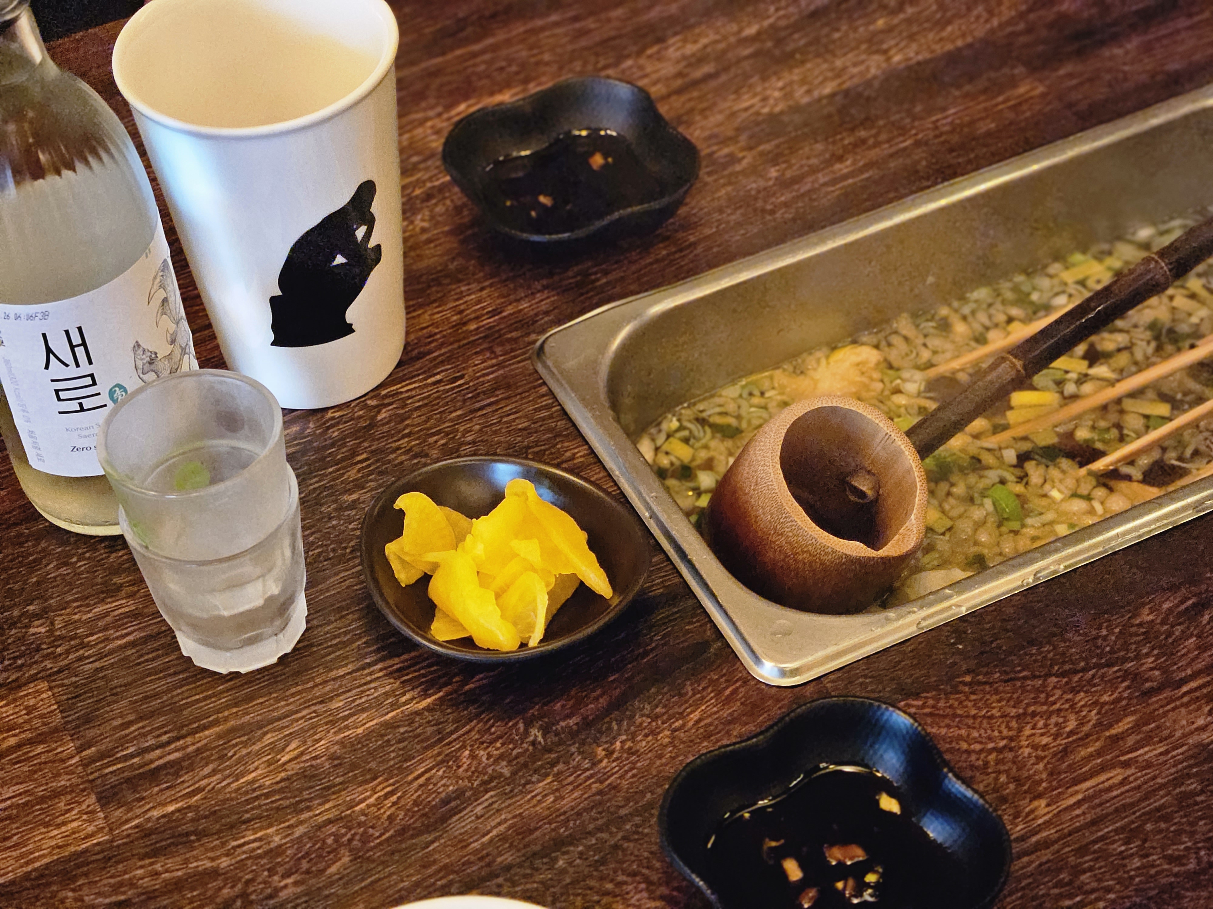 테이블마다 길다란 홈이 있는데 여기에 어묵국물이 담긴 통을 꽂아준다. 어묵 기다리면서 국물 먼저 한입 먹으면서 한잔했다. 국물 뜨는 국자도 대나무로 만든 긴 국자 모양이라 이색적이다.