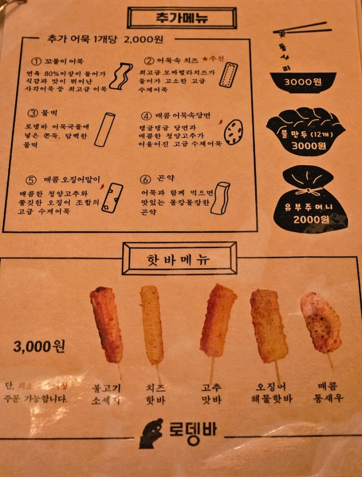 당산에서 이렇게 어묵이 메인 메뉴로 있는 곳은 로뎅바가 유일하다. 쌀쌀한 날씨에 따뜻한 국물에 가볍게 한잔 하고 싶을때 로뎅바 가면 좋을 것 같다.