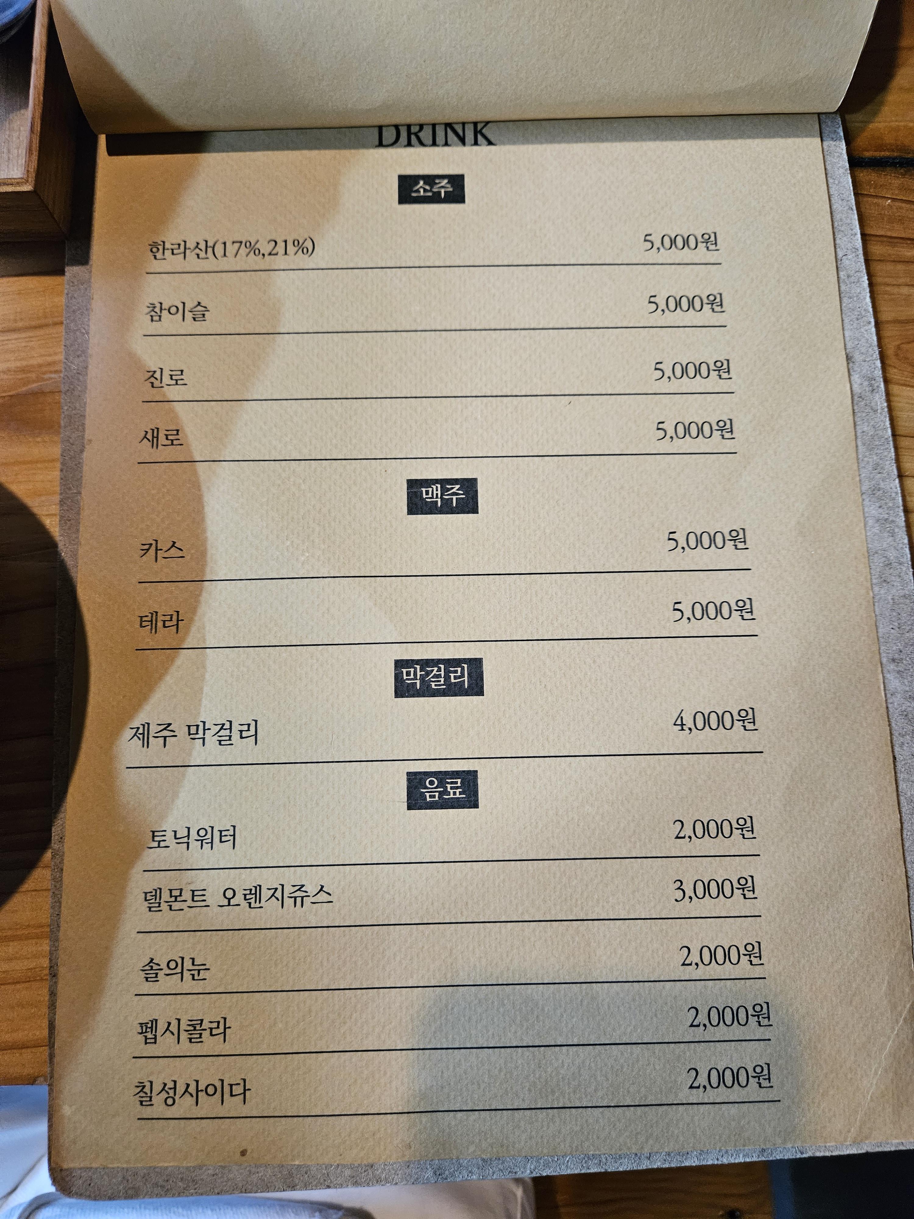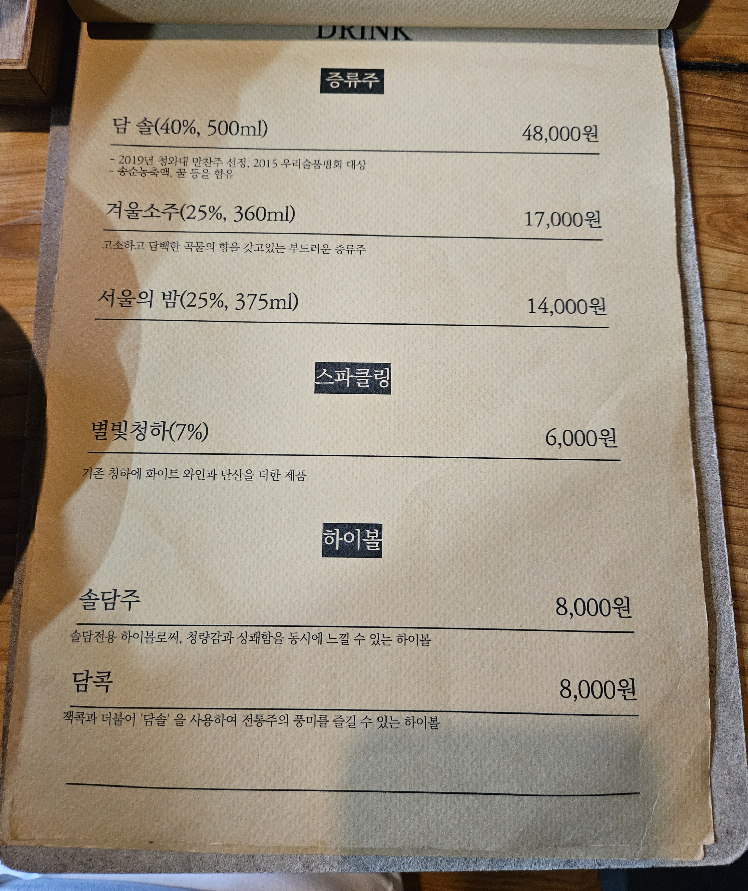 술 종류도 다양해서 기본 소주, 맥주부터 막걸리, 증류수, 하이볼, 스파클링 골라 먹을 수 있어요.