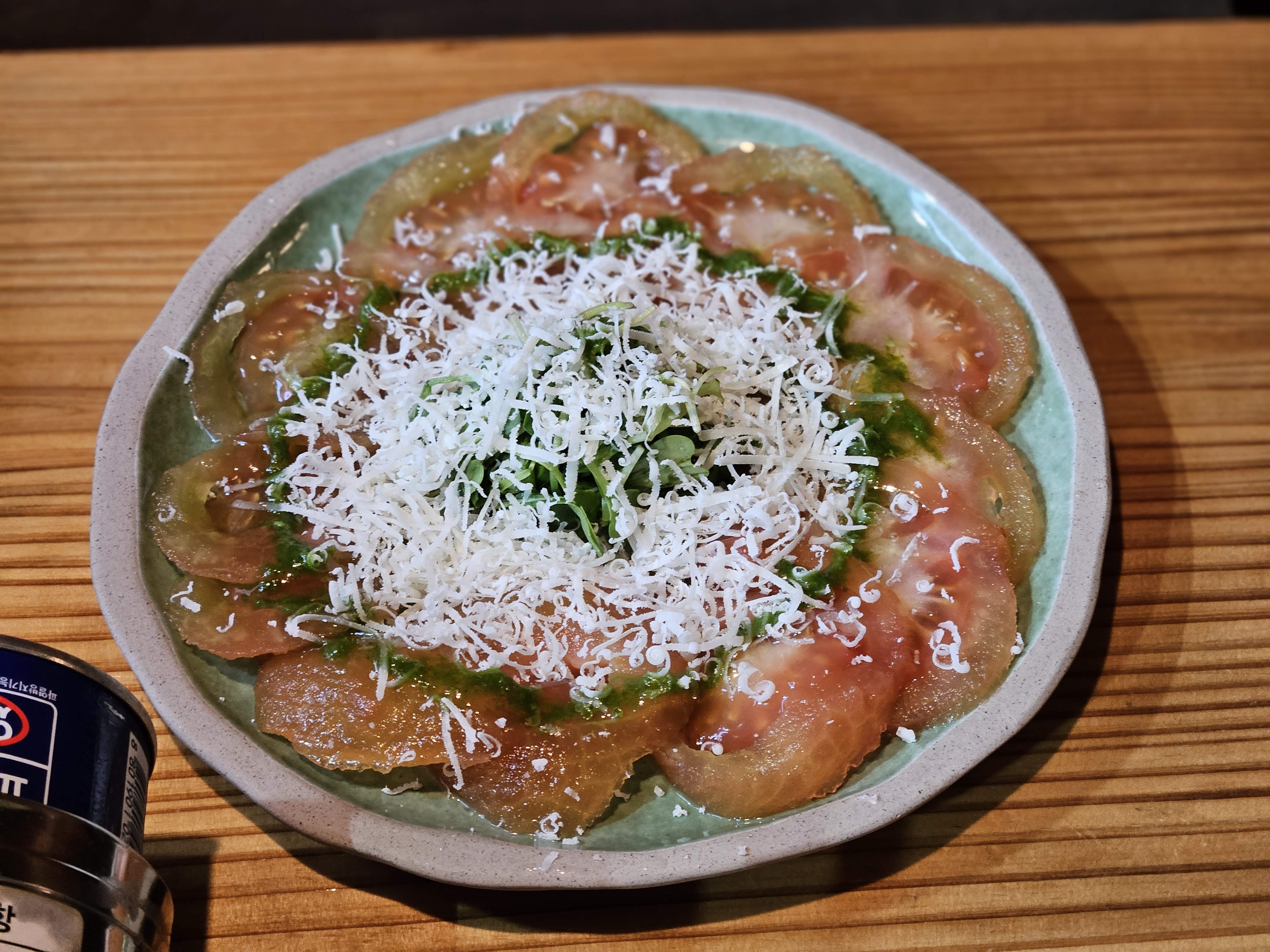 토마토 위에 바질소스랑 갈린 치즈가 올라가 있는데