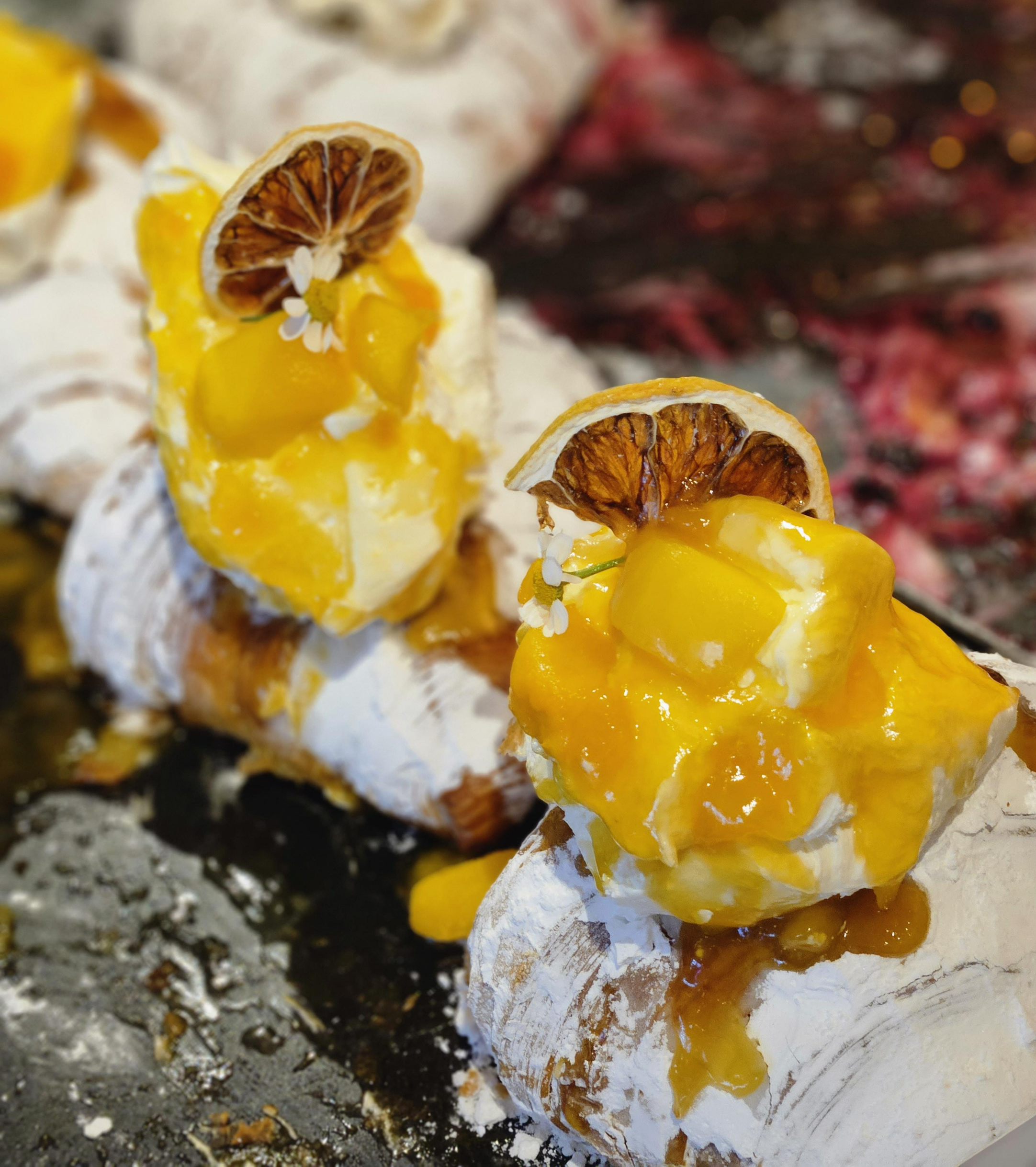 크로와상 위에 녹차, 초코, 망고, 베리 등